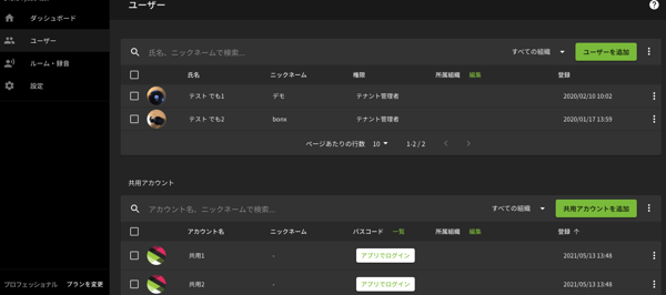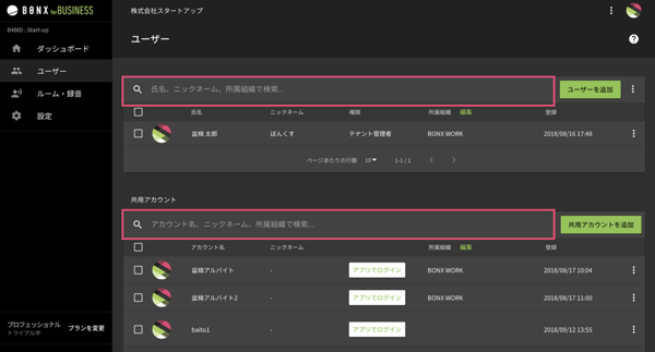 管理コンソール>ユーザー画面にて、アカウント管理を行います。