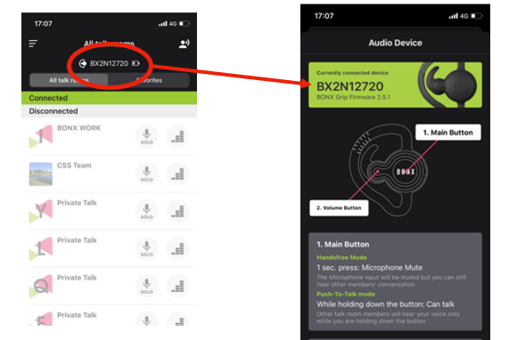 - Bluetooth接続が成功するとBONXアプリやBONX WORKのアプリ上では、接続しているBONXのシリアルナンバーが表示されます。